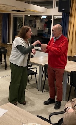 Tijdens het kopje koffie na het eten vroeg Karin nogmaals het woord. Afgelopen jaar hebben een aantal bestuurders afscheid moeten nemen omdat hun termijnen er op zaten. Een van hen was vml. voorzitter Leersum Frans Groot. Met een kleine attentie werd Frans ‘onderscheiden’. Met hem ook vml. bestuurslid bezoekwerk Mieke Vink. Hartelijk dank voor jullie jarenlange inzet. Overigens blijven beiden vrijwilliger voor hun afdeling.